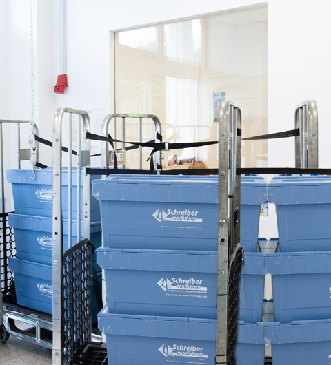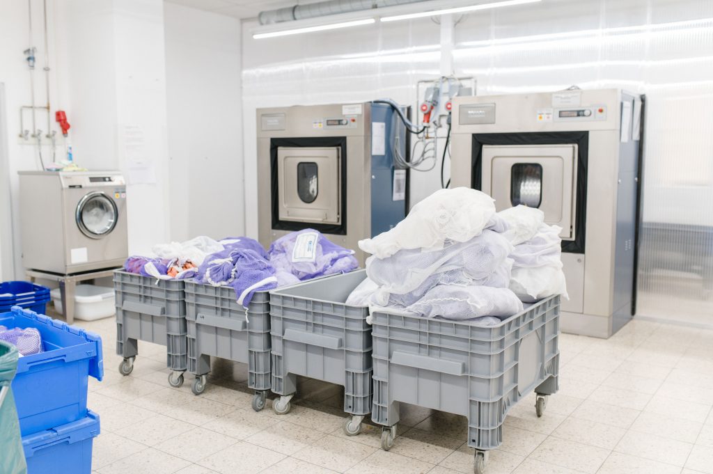 Wir waschen schonend und desinfizierend in industriellen Wasch- Schleudermaschinen mit getrennten Zugängen für Be- und Entladung.